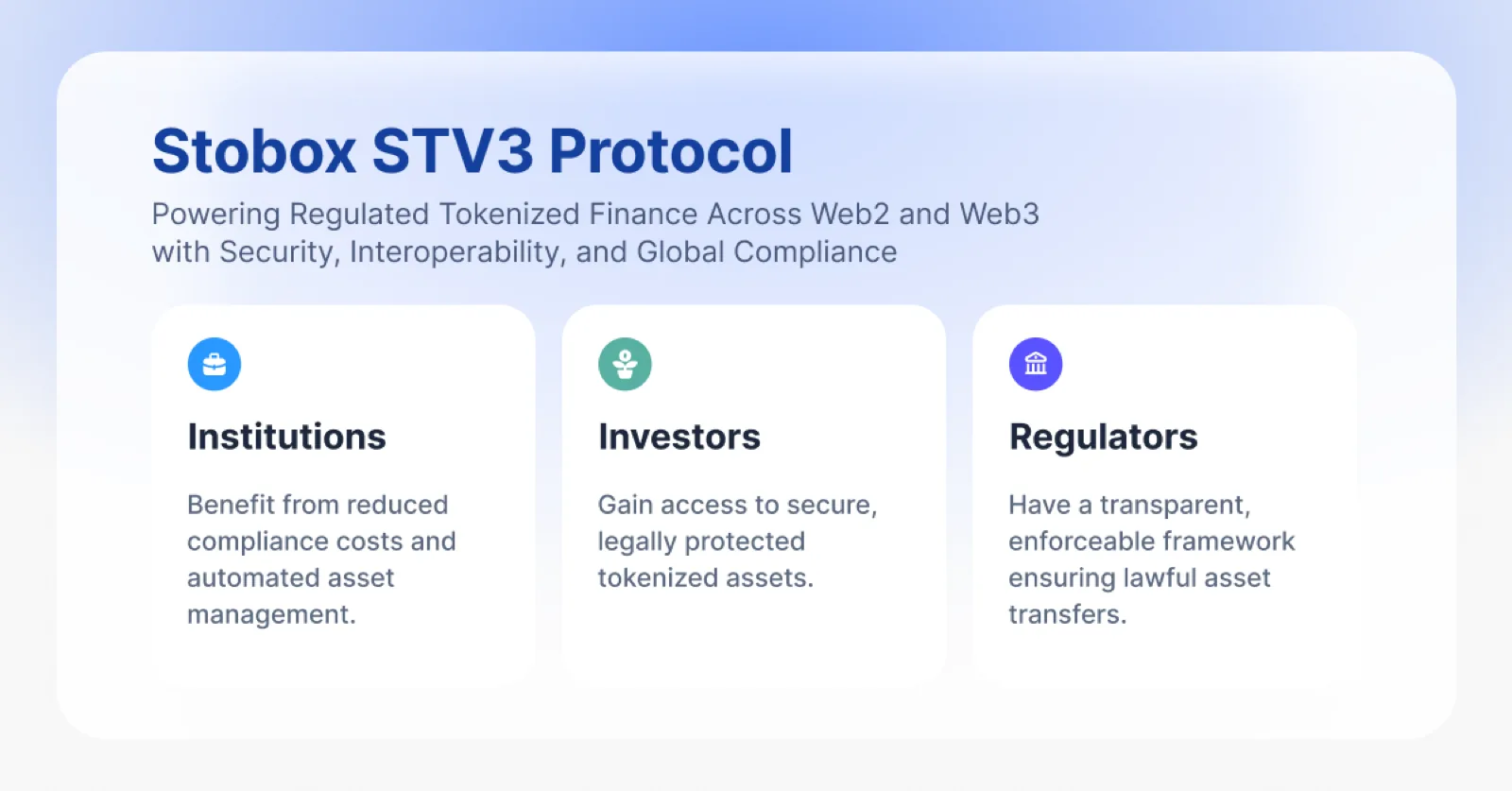 The Stobox STV3 Protocol is a cutting-edge framework designed for the compliant tokenization of assets. It enhances security, ensures regulatory compliance, and automates asset governance through advanced smart contract functionality. The first token issued on this protocol is the Stobox Utility Token (STBU), ensuring that it remains compliant with potential future regulations while serving as a functional asset within the Stobox ecosystem.