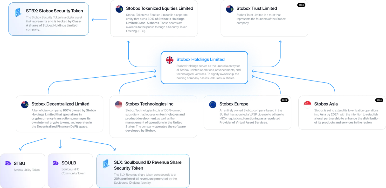 - Stobox Technologies Inc. (US): The primary entity responsible for the development and execution of our tokenization products and services. This entity is fully compliant with SEC Regulations, registered in the State of Wyoming, and has innovatively tokenized 100% of its equity via the STBX Stobox Security Token. These offerings have been made available through multiple rounds under regulations such as Reg D 506c, Reg S, and the Prospectus Directive.