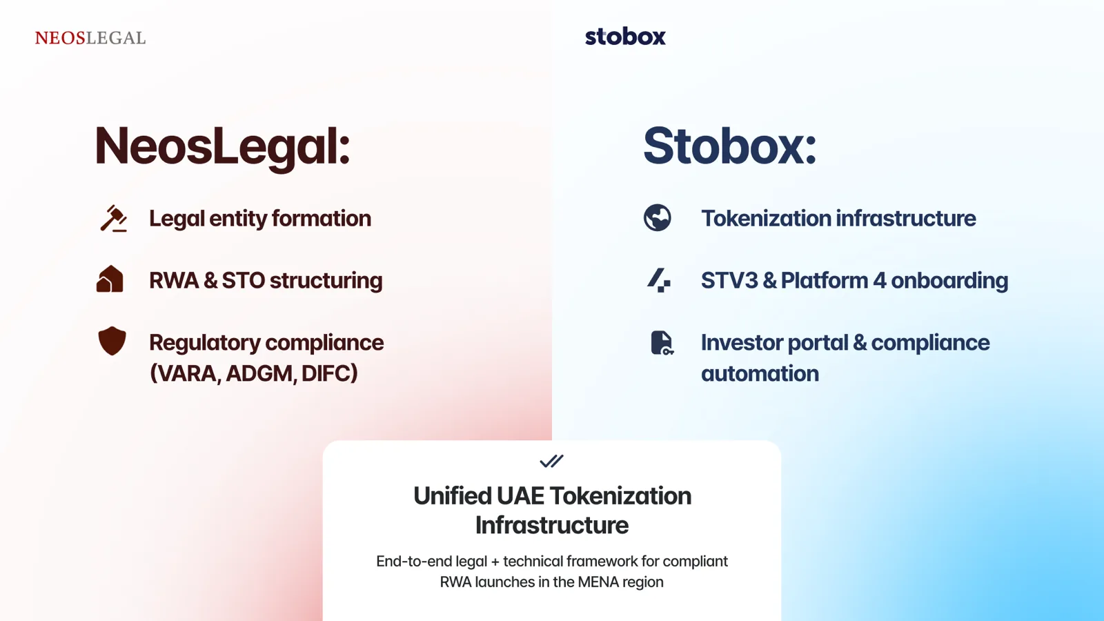 This partnership will enable Stobox clients operating in the UAE and wider Gulf region to benefit from seamless legal infrastructure, delivered through the award-winning NeosLegal team, in full alignment with the Stobox Tokenization Onboarding Framework.